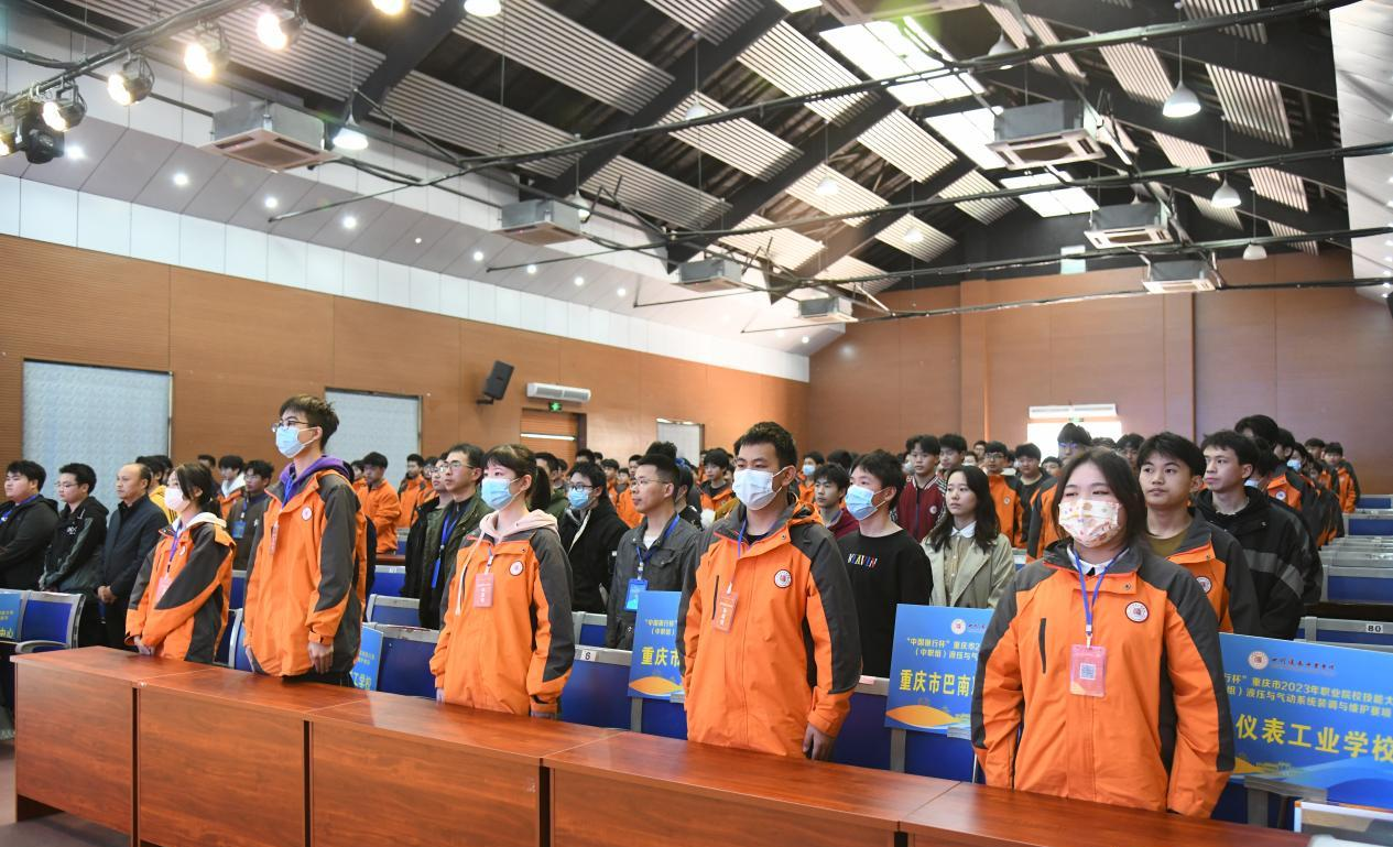 开赛当天,在我校泉苑大礼堂举行开幕式,市教科院专家陈卫红,学校校长熊满川、副校长薛千万,竞赛办、自动系等部门负责人、全体参赛领队和参赛选手参加。学校校长熊满川致欢迎词,他对到场的专家与选手表示热烈欢迎,并鼓励全体参赛选手比出水平,赛出成绩,预祝比赛圆满成功。重庆工贸职业技术学院智能制造学院院长王东代表裁判员宣誓,肖亮同学代表参赛选手宣誓。市教科院专家陈卫红对学校赛事筹备工作给予充分肯定,希望以竞技大赛为舞台,不断创新技能人才培养模式,完善技能人才培养长效机制、拓宽技能人才成长道路,助力重庆培养出更多“大国工匠”。